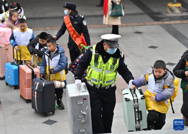 1月26日,民警在廣西南寧火車站幫助準(zhǔn)備“闖東北”的小旅客進(jìn)站上車。