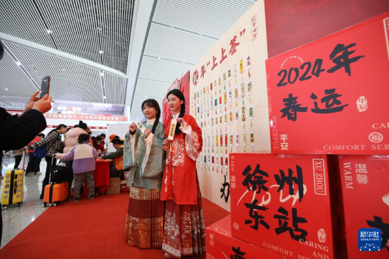 1月26日,旅客在徐州東站候車大廳身著漢服拍照。