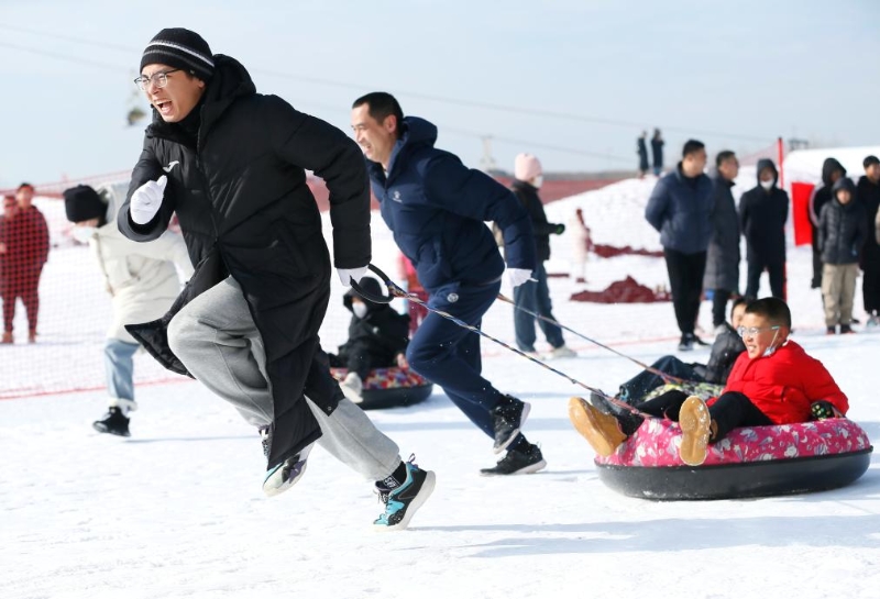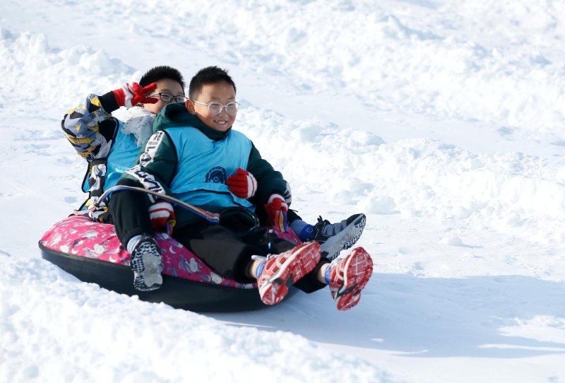 1月25日,學(xué)生和家長在山東省青島市即墨區(qū)金口鎮(zhèn)丁字灣金山滑雪場進(jìn)行雪圈拉力比賽。