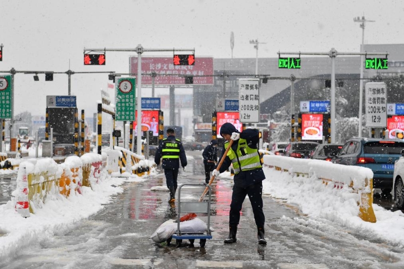 1月22日,工作人員在長張高速長沙西收費站拋撒融雪劑。新華社記者 陳振海 攝