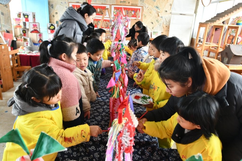 1月29日,浙江省建德市航頭中心幼兒園的孩子在老師指導(dǎo)下為“板凳龍”添色。