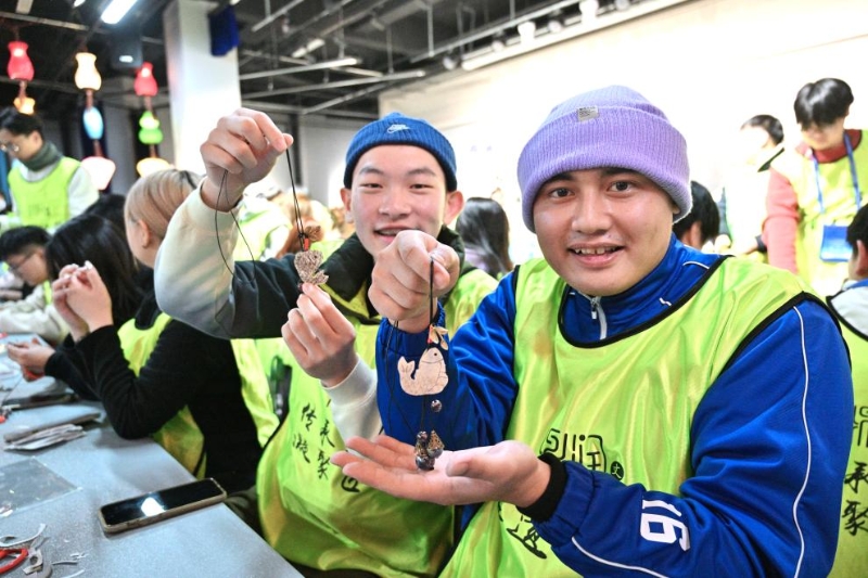 冬令營(yíng)營(yíng)員羅正浩(右)和張畯在吉林省松原市鼎潤(rùn)文化創(chuàng)意產(chǎn)業(yè)園展示他們制作好的魚皮項(xiàng)鏈(1月24日攝)。新華社記者 陳曄華 攝