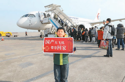 1月26日,在上海虹橋機場,一位小旅客手舉標語牌在國產大型客機C919前合影。這是C919首度服務春運。