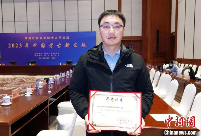 1月30日,2023年中國考古新發(fā)現(xiàn)在北京揭曉發(fā)布,肯尼亞共和國博高利亞湖舊石器時(shí)代遺址入選中國2023年國外考古新發(fā)現(xiàn),趙清坡代表項(xiàng)目領(lǐng)取榮譽(yù)證書在會(huì)場(chǎng)留影。中新網(wǎng)記者 孫自法 攝