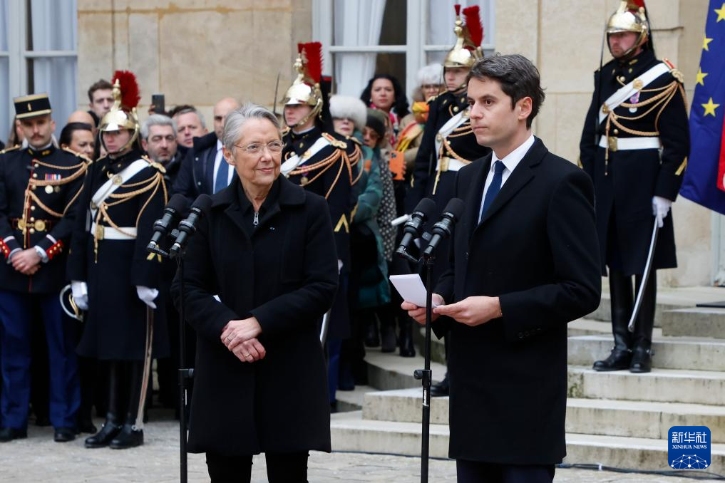 1月9日,加布里埃爾·阿塔爾(前右)在法國(guó)巴黎總理府舉行的權(quán)力交接儀式上致辭。(圖源:新華社)