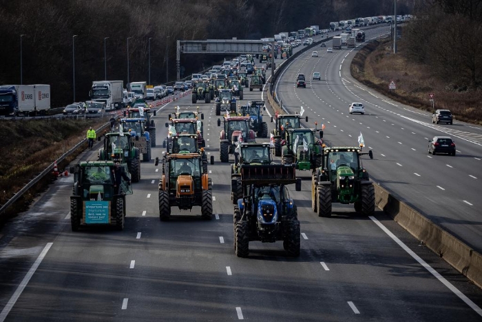 1月29日,在法國巴黎附近的隆維利耶,農(nóng)業(yè)生產(chǎn)者用拖拉機(jī)封堵通往巴黎的高速公路。新華社發(fā)(奧雷利安·莫里薩爾攝)