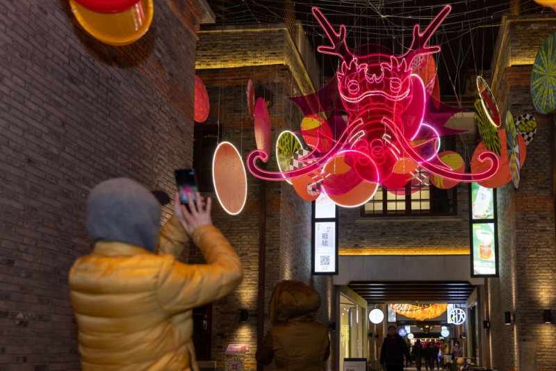 在上海市虹口區(qū)四川北路的“今潮8弄”,人們在龍年燈光藝術裝置點綴的弄堂中拍照(2024年1月26日攝)。新華社記者 王翔 攝