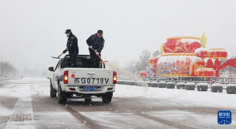 2月4日,在江蘇省連云港市海州區(qū)朝陽(yáng)東路,城管工作人員在撒融雪劑。