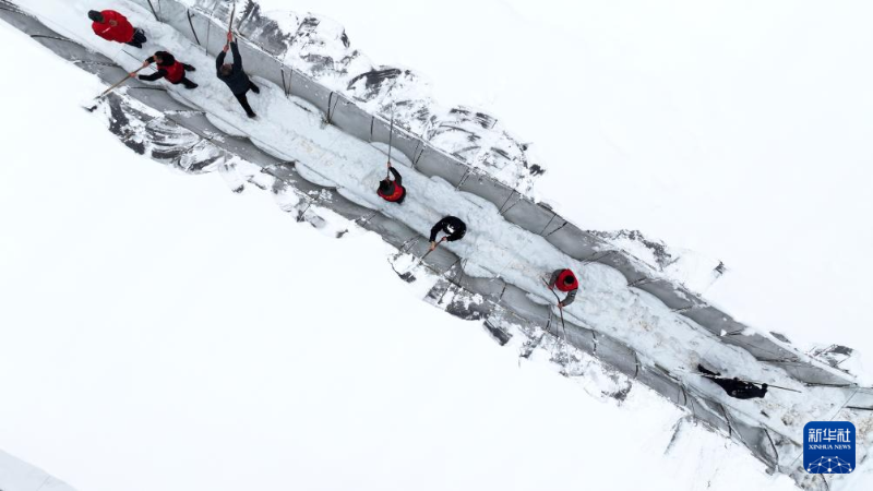 2月4日,在湖南省臨湘市羊樓司鎮(zhèn),公路養(yǎng)護(hù)人員在進(jìn)行除冰作業(yè)。