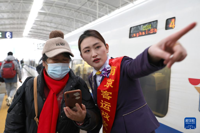 2月4日,在上海站站臺(tái),南京客運(yùn)段乘務(wù)員在指引旅客前往車廂。