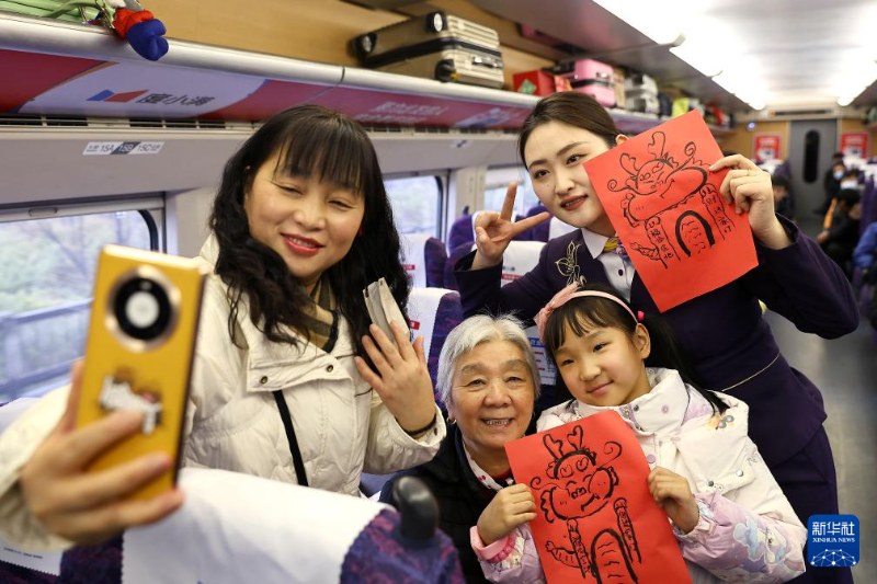 2月4日,在G9284次列車上,旅客邀請(qǐng)南京客運(yùn)段乘務(wù)員合影留念。