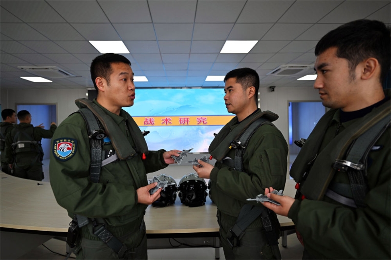 空軍航空兵某旅飛行一大隊(duì)飛行員完成空中對(duì)抗后,到戰(zhàn)術(shù)研究室展開(kāi)復(fù)盤(pán)(2023年12月19日攝)。新華社發(fā)(余紅春 攝)
