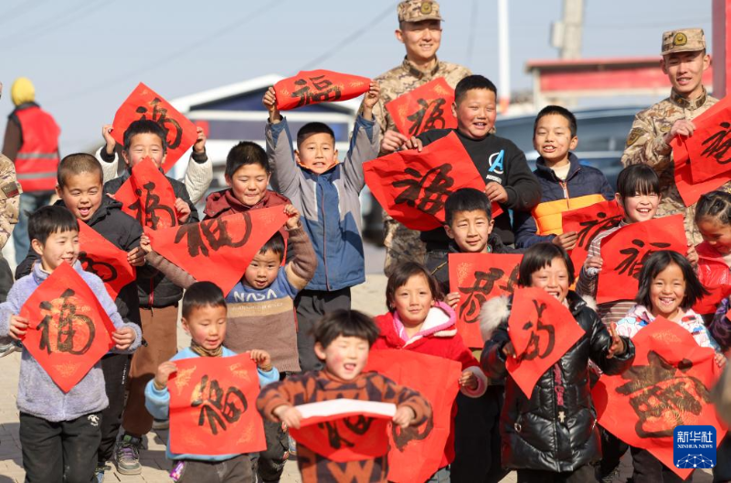 在甘肅省積石山縣陽洼村,武警甘肅總隊(duì)臨夏支隊(duì)官兵和小朋友一起展示“?!弊?1月30日攝)。新華社發(fā)(侯崇慧 攝)