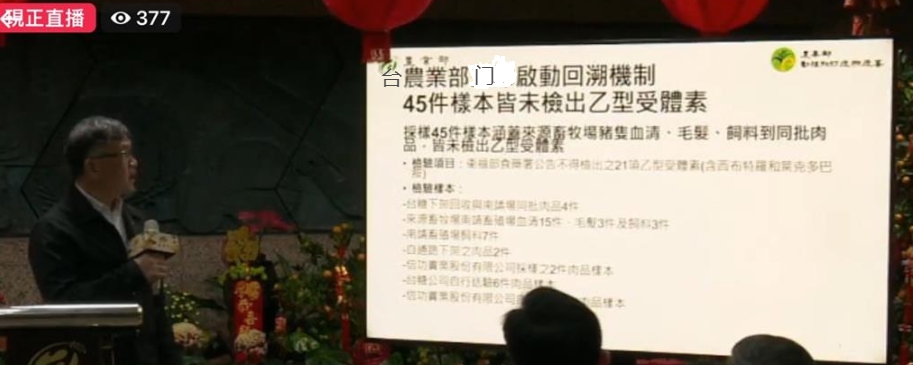 臺(tái)農(nóng)業(yè)部門動(dòng)植物防疫檢疫署署長邱垂章表示,目前檢測(cè)的批號(hào)和臺(tái)中市政府檢測(cè)的是同樣的檢體批號(hào),也有檢查有沒有異常交叉污染情況,包括豬的血清、毛發(fā)、飼料廠等,也都一并送檢,共有45個(gè)樣品,做了很多檢測(cè),都沒有檢出乙型受體素,希望消費(fèi)者可以安心購買,在農(nóng)歷年前,會(huì)再擴(kuò)大五倍檢測(cè)能量,嚴(yán)格把關(guān)。