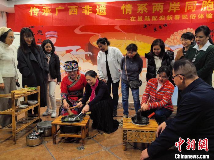 當天,廣西南寧市臺辦組織臺胞和陸配代表開展“傳承廣西非遺情系兩岸同胞”在邕陸配迎新春民俗體驗活動,打油茶、品非遺,送溫暖、話融合。
