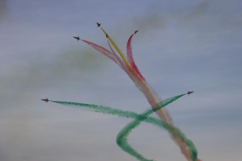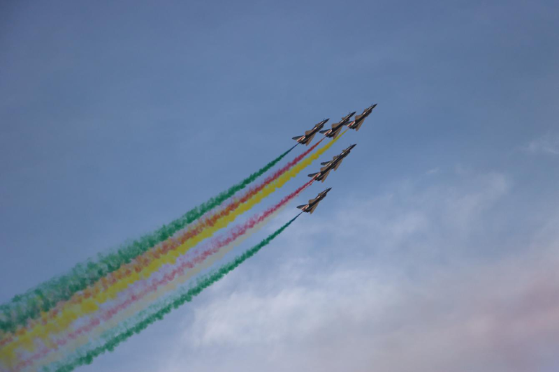 當(dāng)日的飛行表演中,空軍八一飛行表演隊(duì)連續(xù)做出“四機(jī)垂直開(kāi)花”“五機(jī)水平開(kāi)花”“六機(jī)分組開(kāi)花”等一系列高難度表演動(dòng)作。由象征中沙兩國(guó)國(guó)旗的“紅黃白綠”四種顏色組成的彩色拉煙,在高空綻放開(kāi)花,時(shí)而如牽牛花開(kāi)、金鐘倒掛,時(shí)而如天女散花、五彩絢爛,讓利雅得的上空更加色彩斑斕。