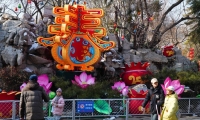 游客在前門大街參觀游覽,前門五牌樓上裝飾有龍紋(2月5日攝)。