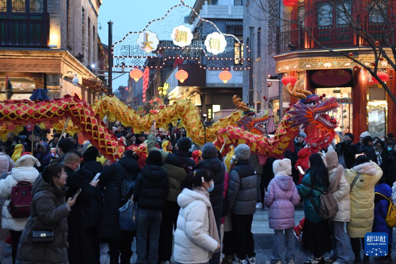 游客在前門大街觀看舞龍表演(2月2日攝)。