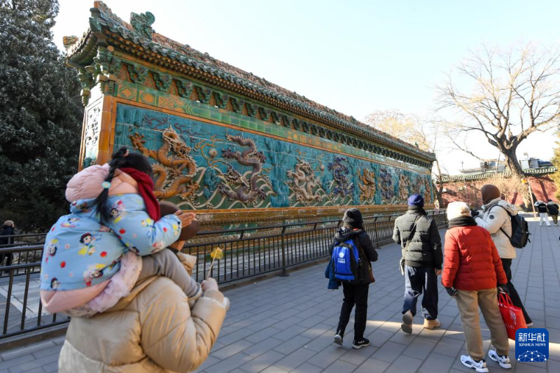 游客在北海公園內(nèi)參觀九龍壁(1月24日攝)。