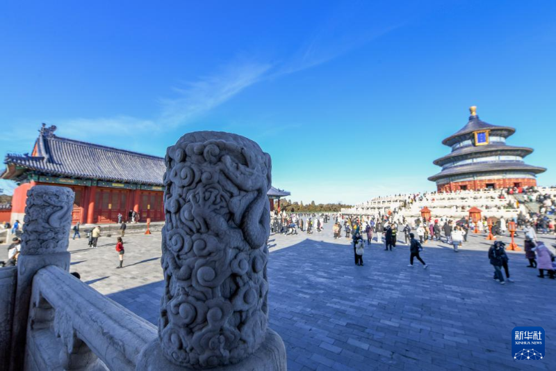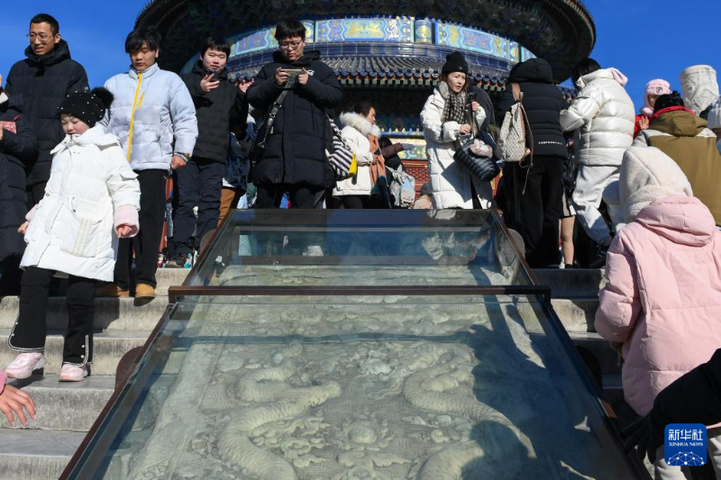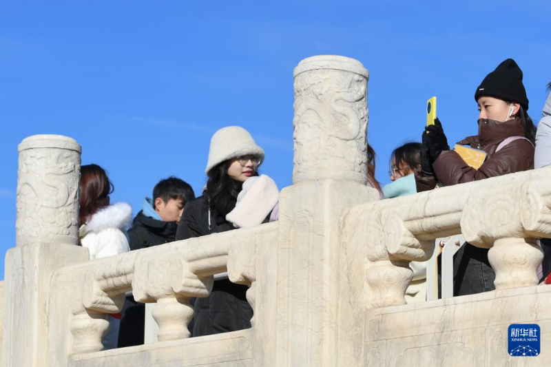 游客在天壇公園參觀游覽,天壇公園欄桿上雕刻有龍的形象(1月23日攝)。