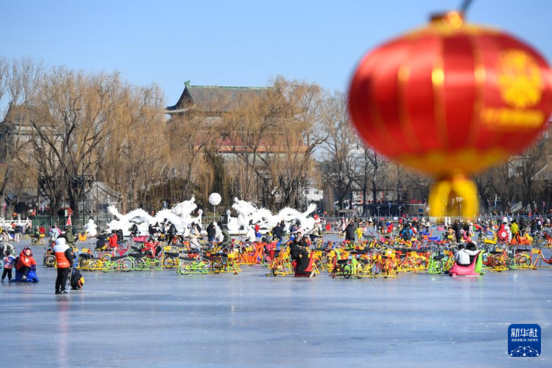 在什剎海冰場上,游客在兩條龍形裝飾旁滑冰(1月24日攝)。