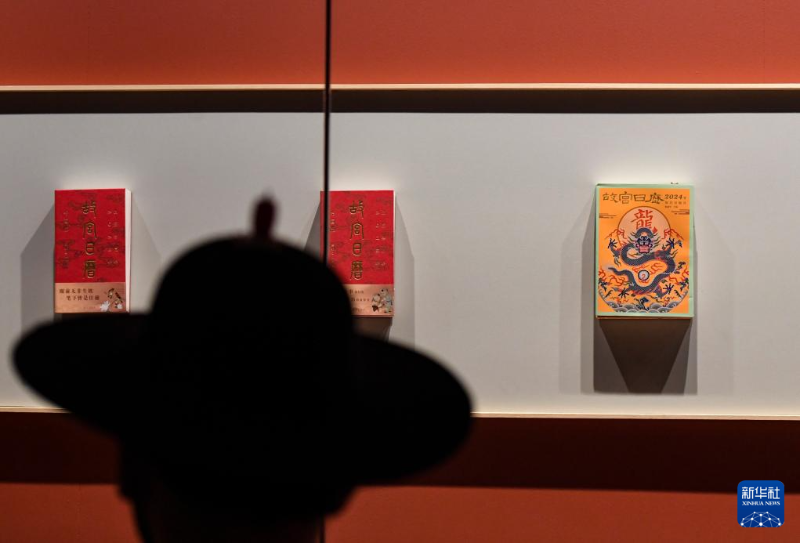 在故宮文華殿,“匯流澄鑒:故宮出版社建社四十周年展”展出了一本封面是龍形象的《故宮日歷》(1月28日攝)。