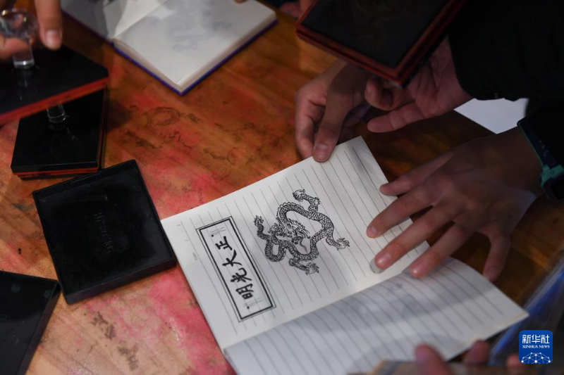 游客在故宮漢字館蓋龍形象的印章(1月28日攝)。