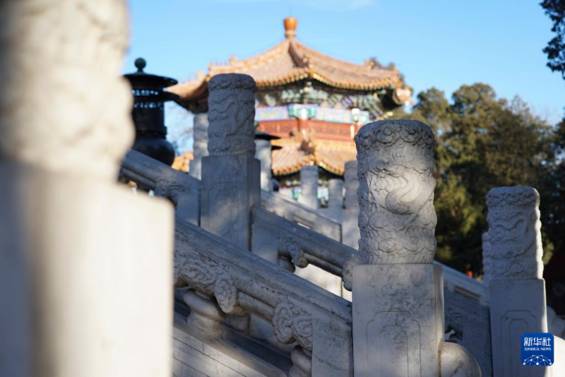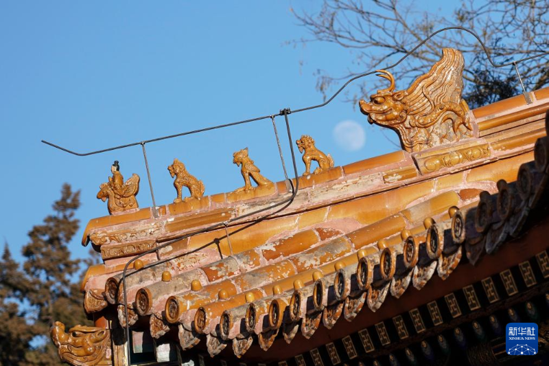 這是景山壽皇殿院內(nèi)一座古建屋頂局部,最右側(cè)的脊獸是神話傳說中龍生的九子之一“嘲風(fēng)”(1月23日攝)。