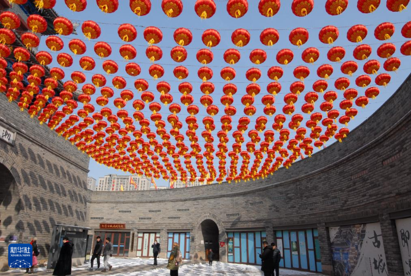 2月6日,游客在山東省青島市即墨古城大紅燈籠下觀賞游玩。
