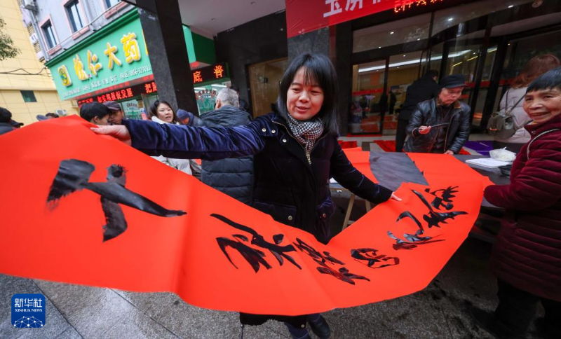 2月5日,市民在貴州省銅仁市玉屏侗族自治縣年集上領(lǐng)取書(shū)法志愿者免費(fèi)書(shū)寫(xiě)的春聯(lián)。