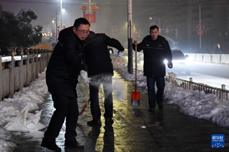 2月5日晚,湖南省臨湘市城市管理和綜合執(zhí)法局工作人員在清理積雪,并開(kāi)展撒鹽作業(yè)。新華社記者 陳振海 攝