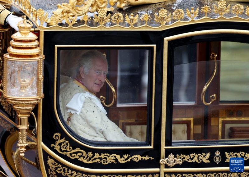 這是2023年5月6日,在英國倫敦,英國國王查爾斯離開白金漢宮,前往威斯敏斯特教堂參加加冕儀式。