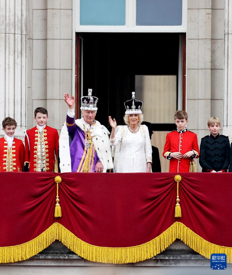 這是2023年5月6日,在英國倫敦,英國國王查爾斯三世和王后卡米拉加冕后在白金漢宮陽臺向民眾揮手致意。