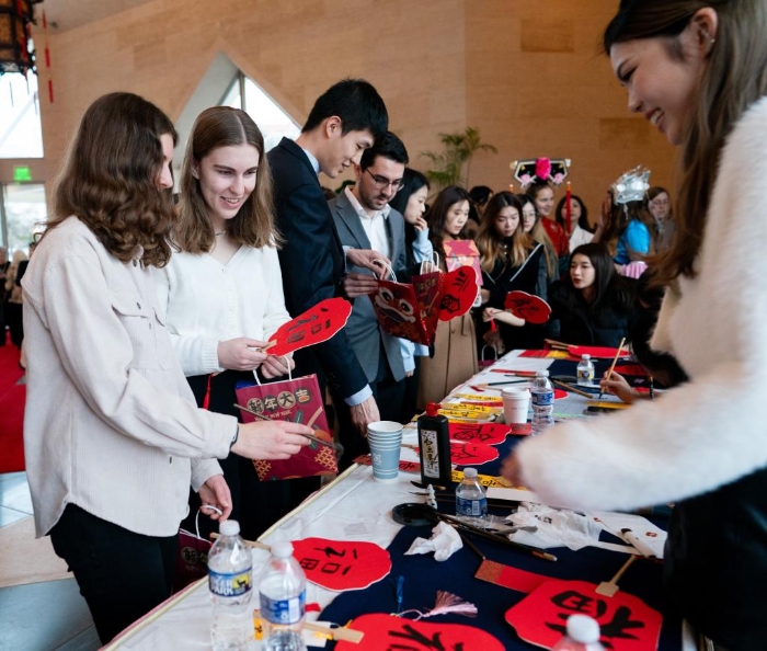 1月28日,在位于美國華盛頓的中國駐美國大使館,美國學生在中美青年新春聯(lián)歡活動上體驗中國書法。新華社記者 劉杰 攝