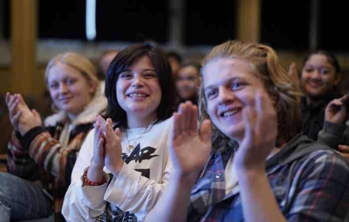 1月30日,在美國華盛頓州塔科馬市林肯中學,將于3月啟程赴華交流的林肯中學12年級學生蒙特塞拉特·羅梅羅-羅查(中)參加美國中學生赴華交流歡送儀式。新華社記者 吳曉凌 攝