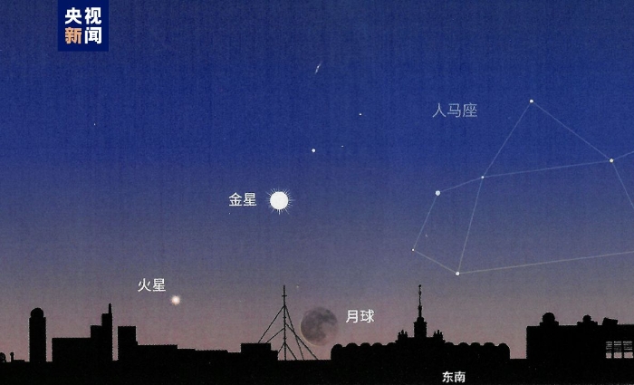 記者從北京天文館獲悉,北京時間2月8日清晨,金星、火星和月亮將在東南方低空上演“雙星伴月”天象。