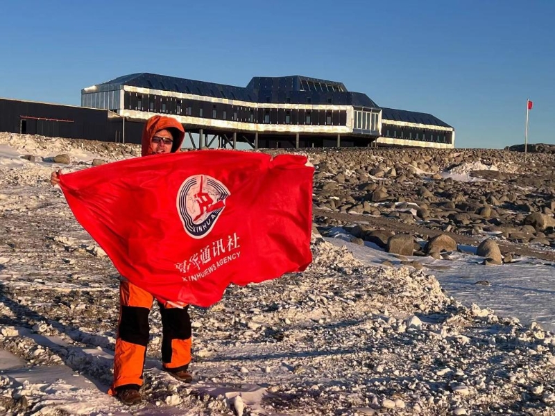 新華社記者周圓在中國南極秦嶺站前。(祝賀攝)