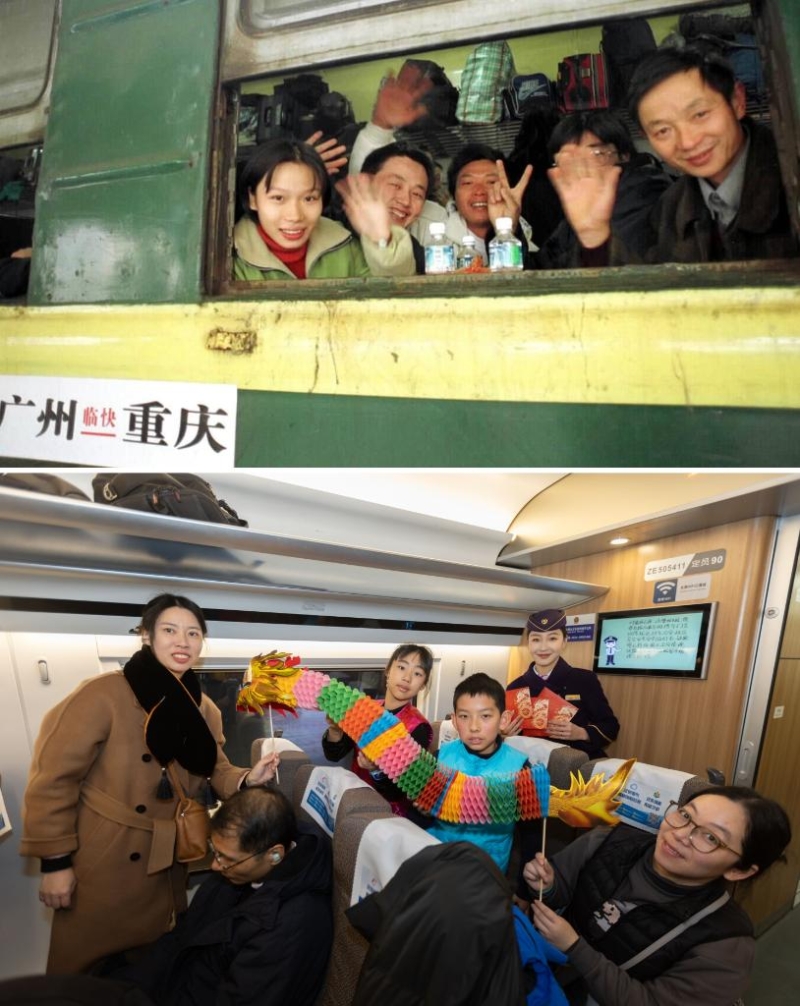 拼版照片:上圖為2000年春運(yùn)期間,在深圳打工的重慶乘客在廣州火車站乘火車返鄉(xiāng)(新華社記者壯錦攝);下圖為2024年1月26日,旅客在G10次高鐵車廂內(nèi)舞動龍年裝飾(新華社記者王翔攝)。