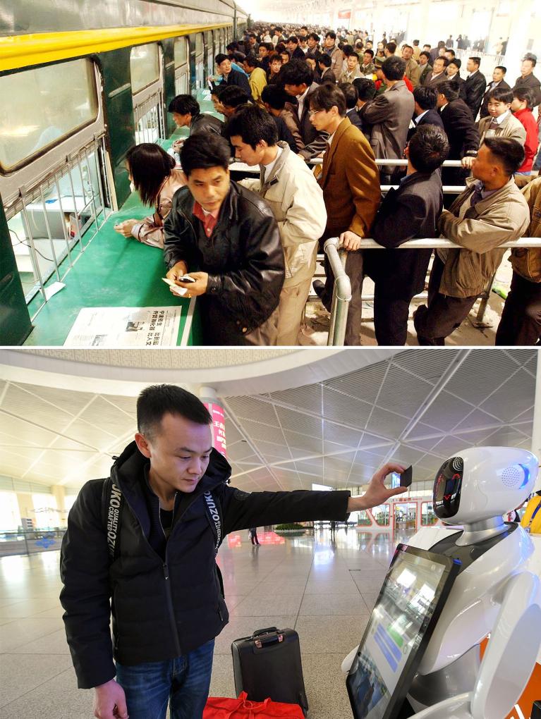 拼版照片:上圖為2003年1月20日,旅客們在位于廣州市黃沙大道的一家倉庫中的臨時(shí)售票處購買車票(新華社記者周文杰攝);下圖為2019年1月22日,在呼和浩特火車東站,旅客將車票放在智能機(jī)器人面前掃碼獲取乘車信息(新華社記者彭源攝)。