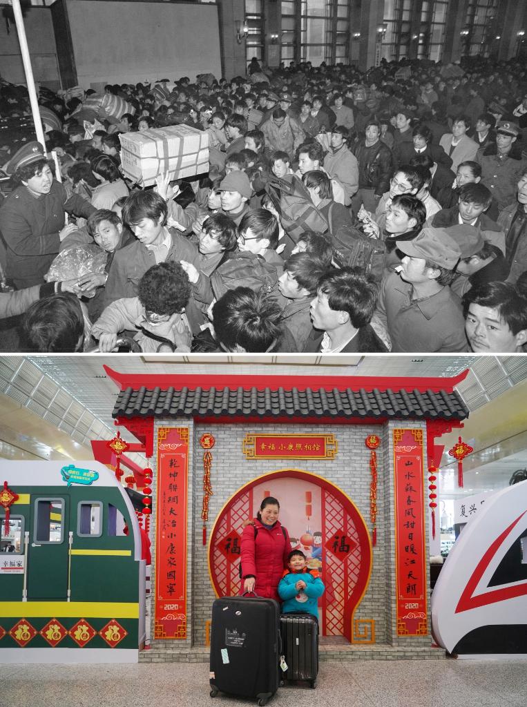 拼版照片:上圖為1993年1月12日,北京火車站開始進(jìn)入春運(yùn)高峰,旅客在排隊(duì)進(jìn)站(新華社記者唐召明攝);下圖為2020年1月10日,旅客在南京南站內(nèi)布置的“幸福小康照相館”拍照留念(新華社記者季春鵬攝)。