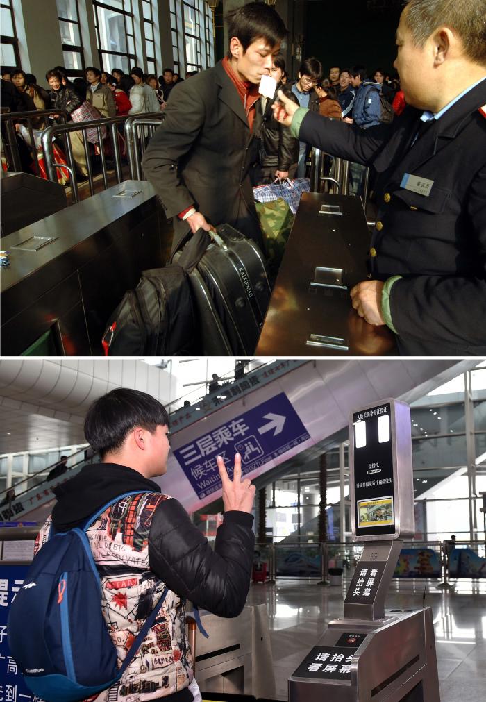 拼版照片:上圖為2006年1月14日,旅客在北京站通過人工檢票進(jìn)站(新華社記者李文攝);下圖為2017年1月13日,一名旅客在廣州南站體驗(yàn)使用人臉識別系統(tǒng)驗(yàn)票驗(yàn)證進(jìn)站(新華社記者梁旭攝)。