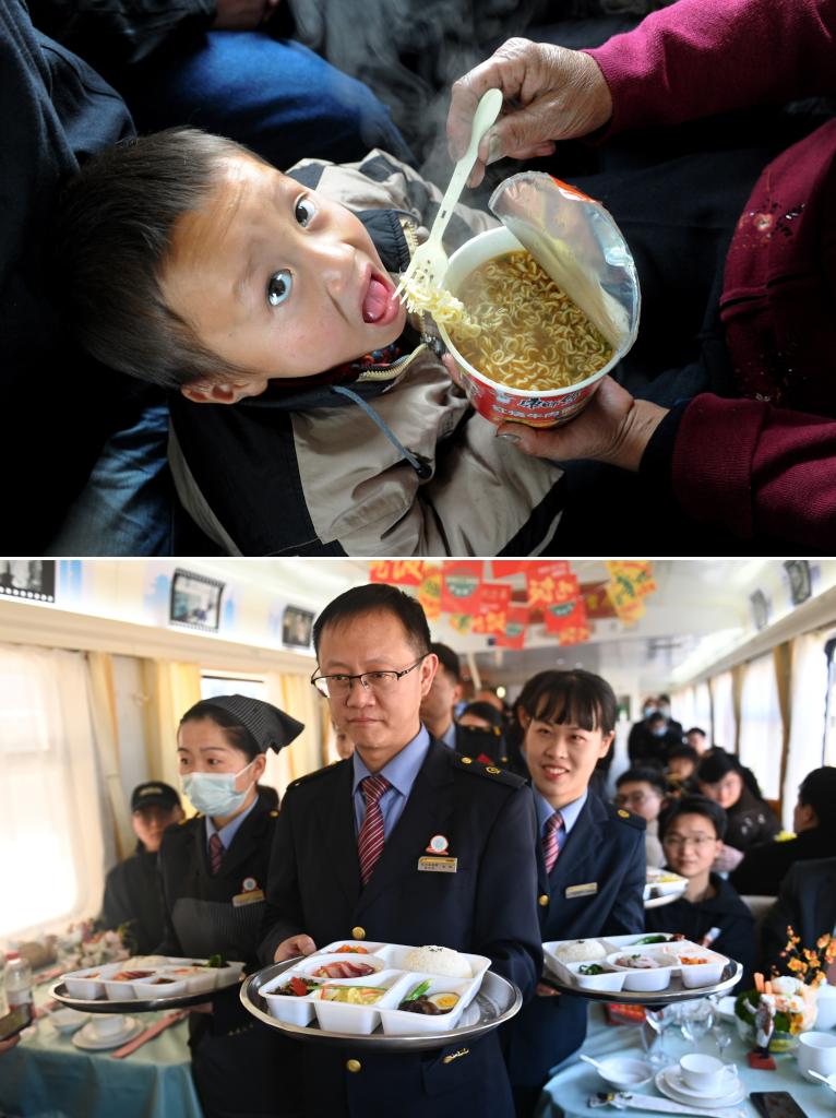 拼版照片:上圖為2011年1月21日,在廣東首趟外來務(wù)工人員專列L160次列車上,一位乘客在喂孩子吃方便面(新華社記者郭晨攝);下圖為2024年1月17日,乘務(wù)員在K212/209次列車餐車上展示盒飯?zhí)撞?新華社記者黃宗治攝)。
