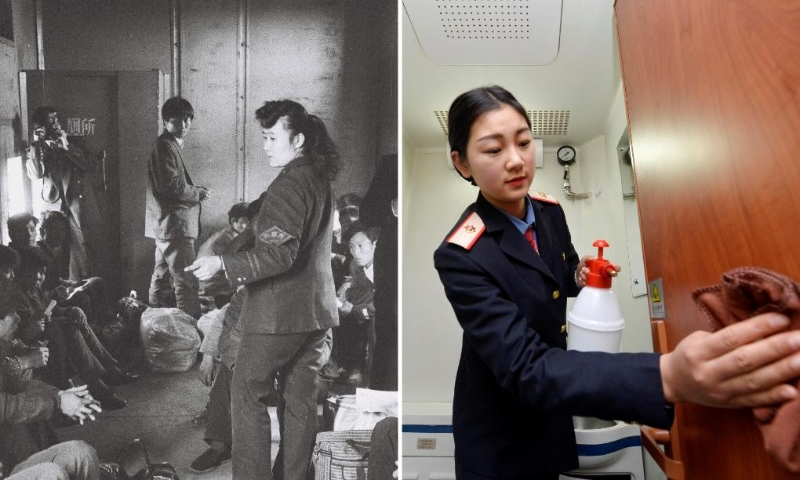 拼版照片:左圖為1994年春運(yùn)期間,在濟(jì)南鐵路局“棚代客”列車上,乘務(wù)員在向乘客講解臨時(shí)搭建的簡易廁所使用注意事項(xiàng)(新華社發(fā));右圖為2017年1月12日,在蘭州鐵路局銀川客運(yùn)段增開的銀川發(fā)往北京的臨時(shí)旅客列車上,乘務(wù)人員在清潔車上的衛(wèi)生間(新華社記者彭昭之?dāng)z)。