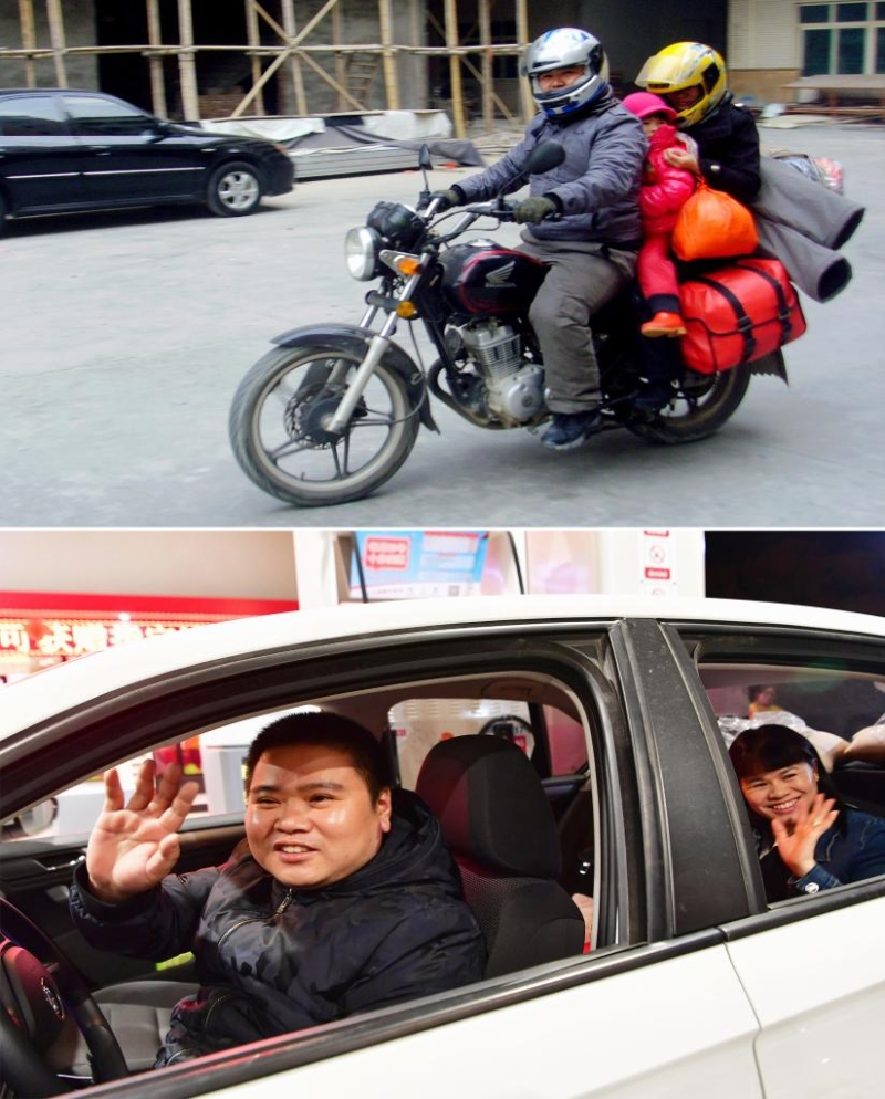 拼版照片:上圖為2013年2月2日,在福建務(wù)工的董日旭帶著家人騎摩托車返回江西老家過年(新華社發(fā));下圖為2020年1月15日,董日旭開著他新買的汽車,準(zhǔn)備和家人開車返鄉(xiāng)過年(新華社記者魏培全攝)。