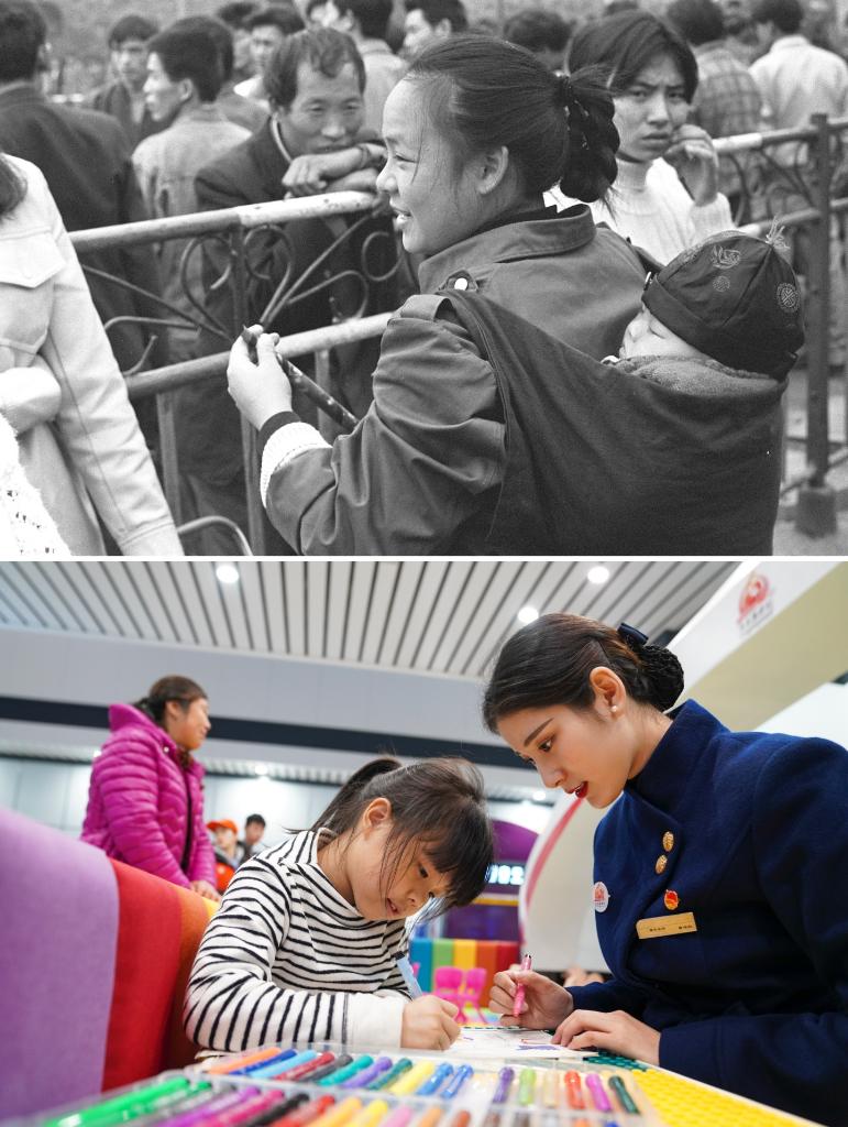拼版照片:上圖為1995年春運(yùn)期間,在廣州火車站,來自四川的“打工妹”趕早乘火車回家過年(新華社記者陳學(xué)思攝);下圖為2020年1月10日,在重慶西站紅巖服務(wù)站的兒童游樂園內(nèi),志愿者曾念紅(右)陪伴候車的小朋友畫畫(新華社記者劉潺攝)。