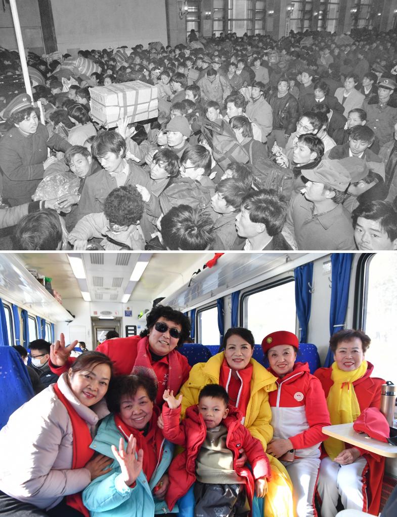 拼版照片:上圖為1993年春運(yùn)期間,旅客在北京火車站排隊(duì)進(jìn)站(新華社記者唐召明攝);下圖為2024年1月28日,乘坐公益“慢火車”6063次列車前往寶成鐵路秦嶺站欣賞雪景的旅客在車內(nèi)合影(新華社記者張博文攝)。