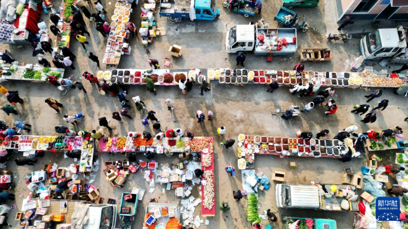 2月6日,村民在山東省東營市東營區(qū)牛莊鎮(zhèn)牛莊村集市上置辦年貨(無人機(jī)照片)。