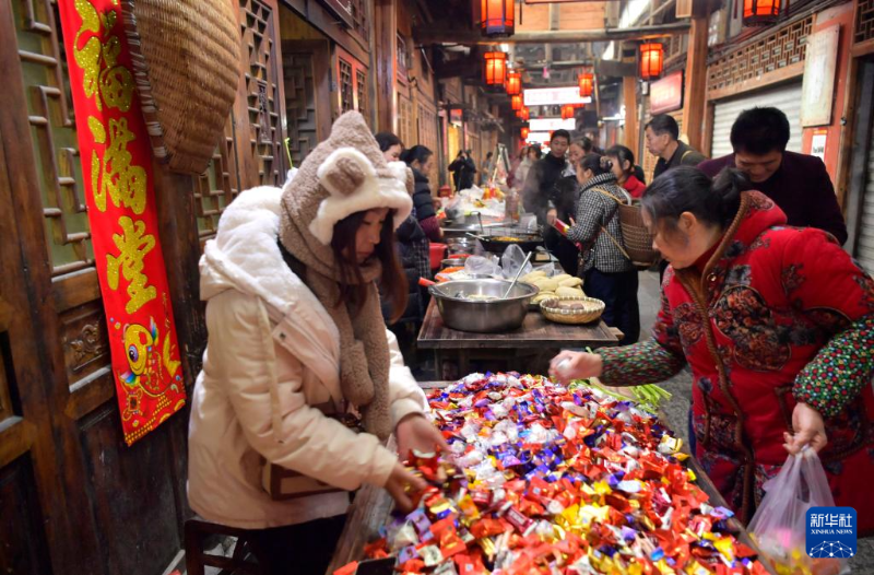 2月7日,人們在湖北省宣恩縣慶陽古街購買年貨。