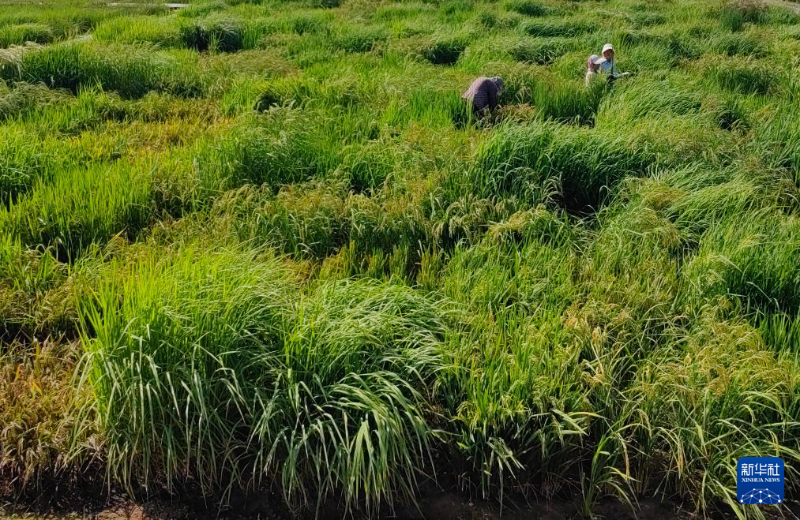 在山東東營的鹽堿地水稻田,科研人員對水稻不同種質(zhì)資源進行耐鹽性鑒定(2023年9月7日攝)。