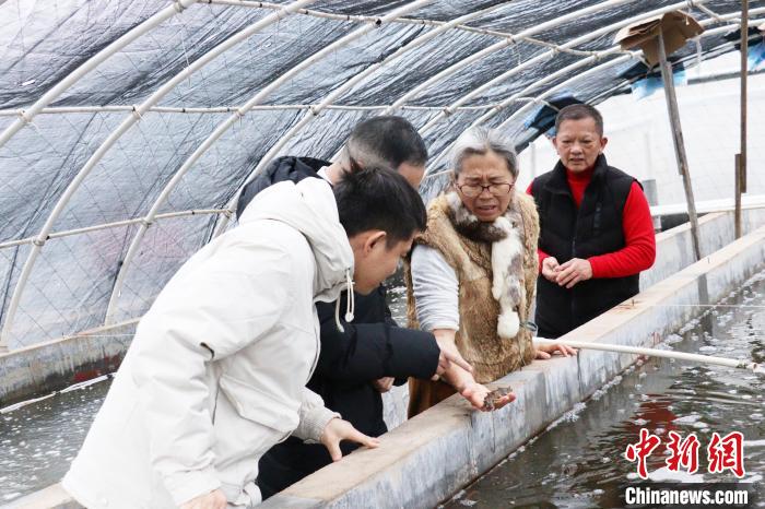 2月6日,邱鳳麗(右二)與丈夫(右一)向來訪者介紹水產(chǎn)養(yǎng)殖情況。林榕生 攝
